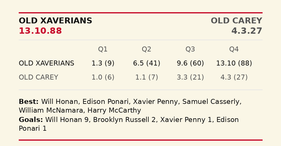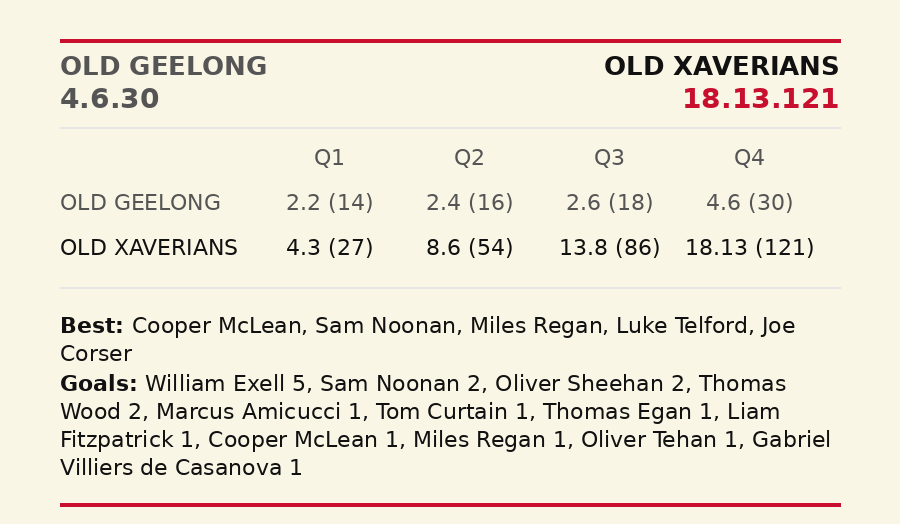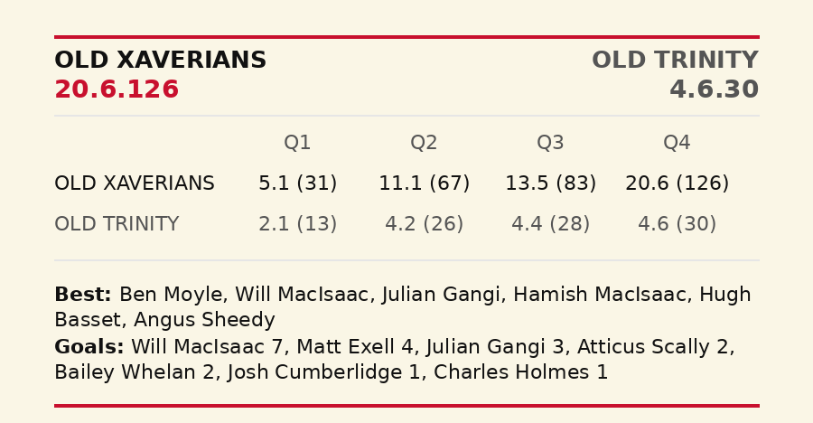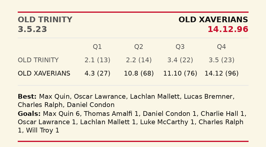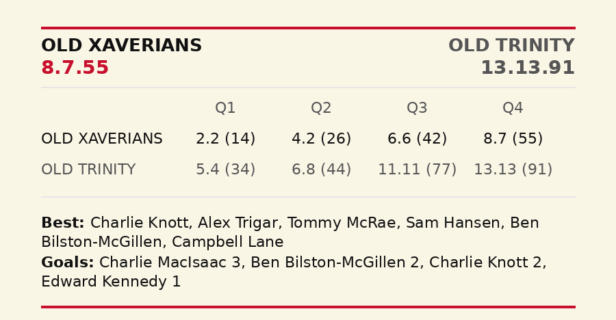 It was just the sixth time in 102 games at Toorak Park since 2011 that the X-Men have been beaten by six goals or more. This despite Trinity squandering a few chances, which was but a small, and their only, blemish. Old Trinity's 55-39 dominance in clearances directly fuelled their massive 68-37 surplus into forward arc entries. Xavs didn't help themselves by playing down the boundary line and several forays forward were turned over by errant kicks or those than jumped out of play between the arcs.