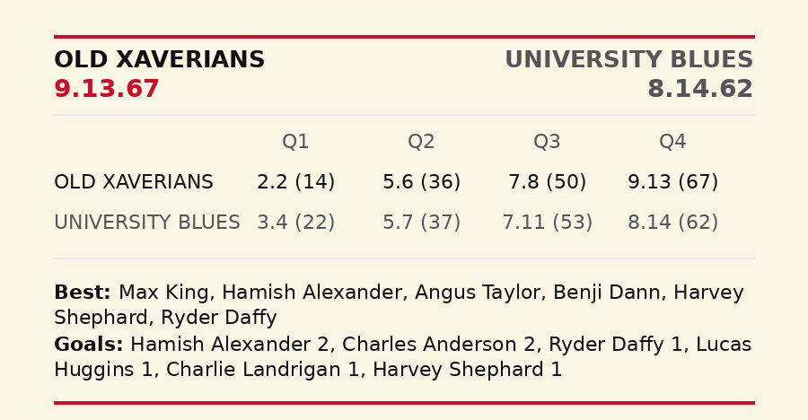 Matt Handley's team celebrated their return to Toorak Park with a nailbiting win over Uni Blues. Xavs trailed at every change but finished the better to take the chocolates.