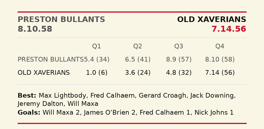 The X-Men were deservedly favourites after their crunching win over St Kevin's on Opening Day but could barely muster a gallop against the visitors. The Ts opened well with the breeze and despite surrendering some momentum in time-on, looked totally in control. Sam Hansen battled hard in the midfield early on, with five clearances in the first quarter and laying six tackles in the second term, which the Xaverians narrowly won. However, the Greenbacks sealed the deal in the third stanza. Xavs added two goals in time-on to break their ducks in the last quarter, a term in which they had the breeze.
