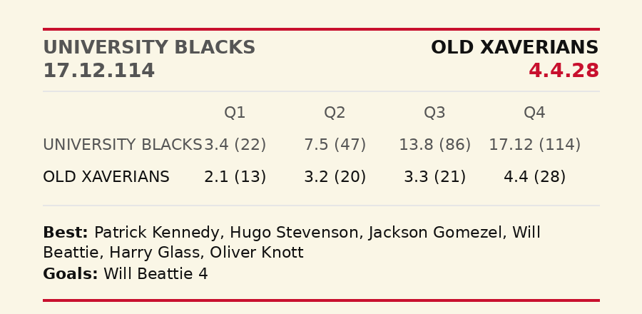 It was a one-sided affair at the Crawford as Blacks ran away wwith it after half-time. Will Beattie was the sole Xavs' goalkicker as the Phoenix was far too strong.