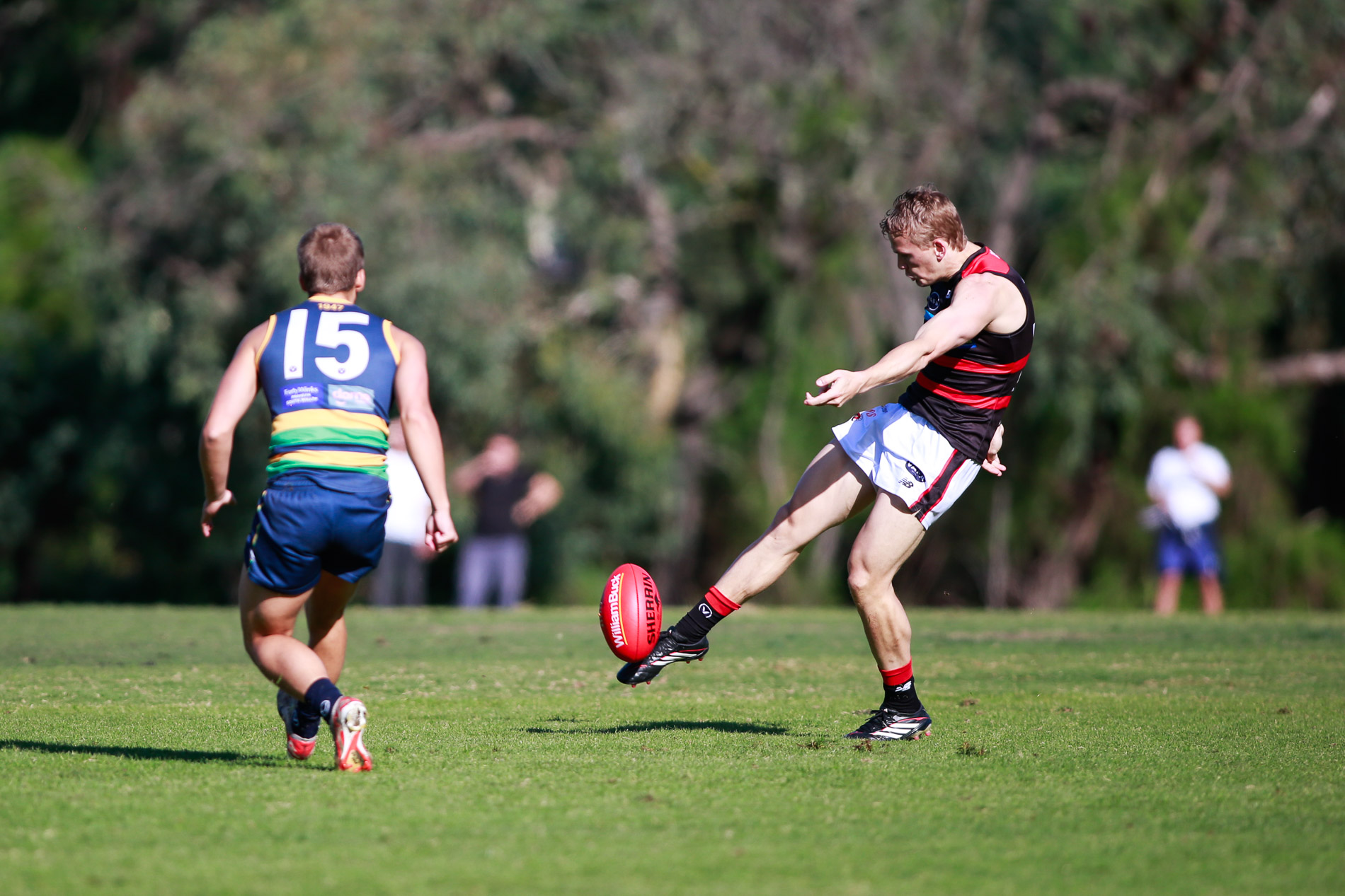 Undermanned but never underprepared, the Xavs opened the first term with gusto. Charlie MacIsaac marked well and booted a couple early, with Wade ‘The Celebrant’ Brusnahan adding the other when he threaded the needle from a set shot.