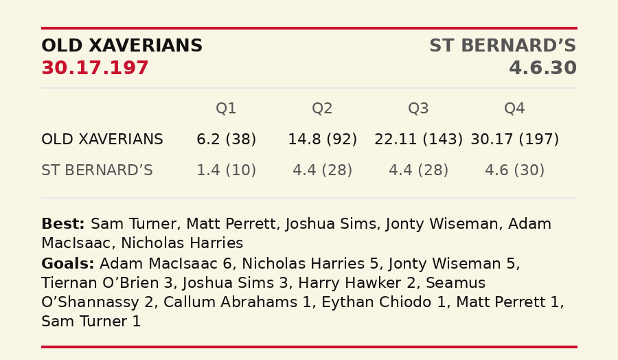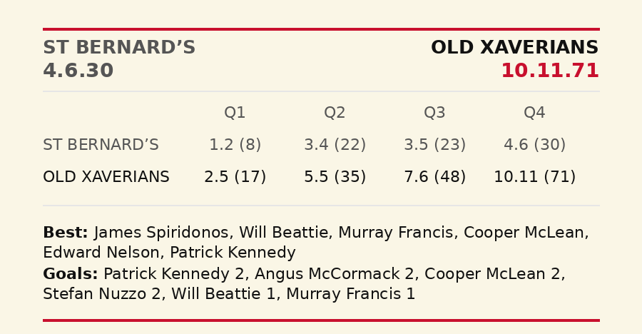 The X-Men had scored five goals without response due to some impressive work. At the back, Jack Whitehead, Alex Trigar and Tommy Dunne were impassable and Kye Walford was adjusting easily to the pace of the game. At 17 minutes, some slick ball work saw MacIsaac mark and score his third. Xavs by 39. SKOB wasted another shot but at 24 minutes, they streamed through the centre and landed their first goal in an hour’s play. Xavs cleared from the centre and Lane went short and the Celebrant booted his second. The home team dashed forward and a puzzling free kick saw them pull a goal back. It was a 30-point difference at the lemons.