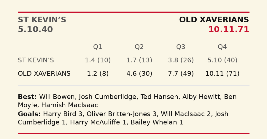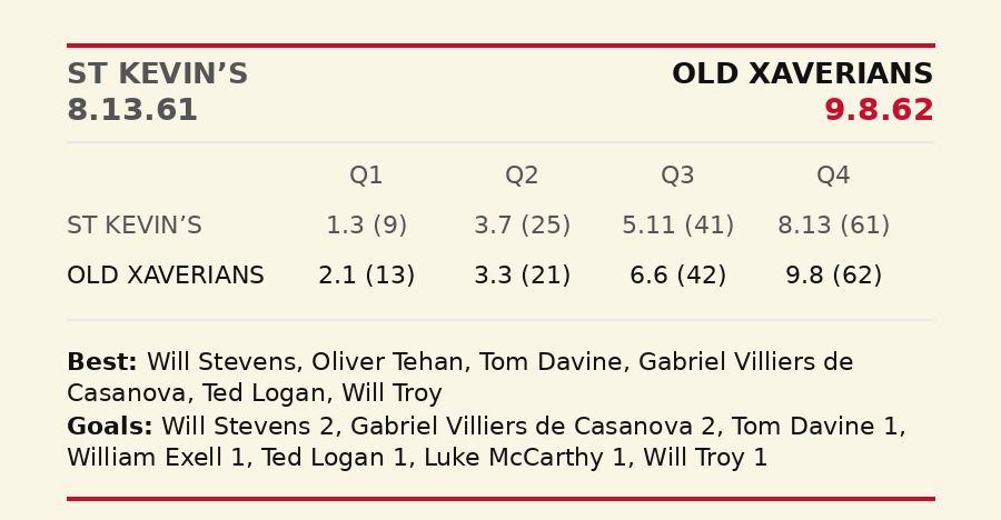 Old Xaverians trailed narrowly at quarter time but found smooth waters thereafter to win their 2025 Grand Final rematch with St Kevin's. Dan Richardson's team was perhaps the youngest OX Reserves team in history, but presented as a very strong outfit. Will Bowen, playing his first game in four seasons, showed plenty on the ball, while Josh Cumberlidge did likewise, carrying last season's great form into the new season.