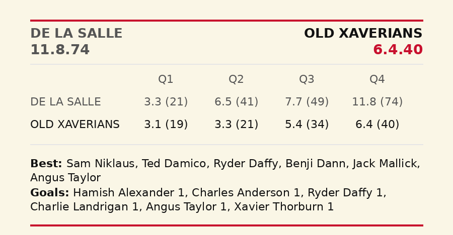 A pacy De La Salle won by 34 points at Dairy Bell after the X-Men had gone with the Blue and Golds until quarter time. The Bellers did the damage in the second and final terms, but despite the result, there were some encouraging performances from the vanquished.