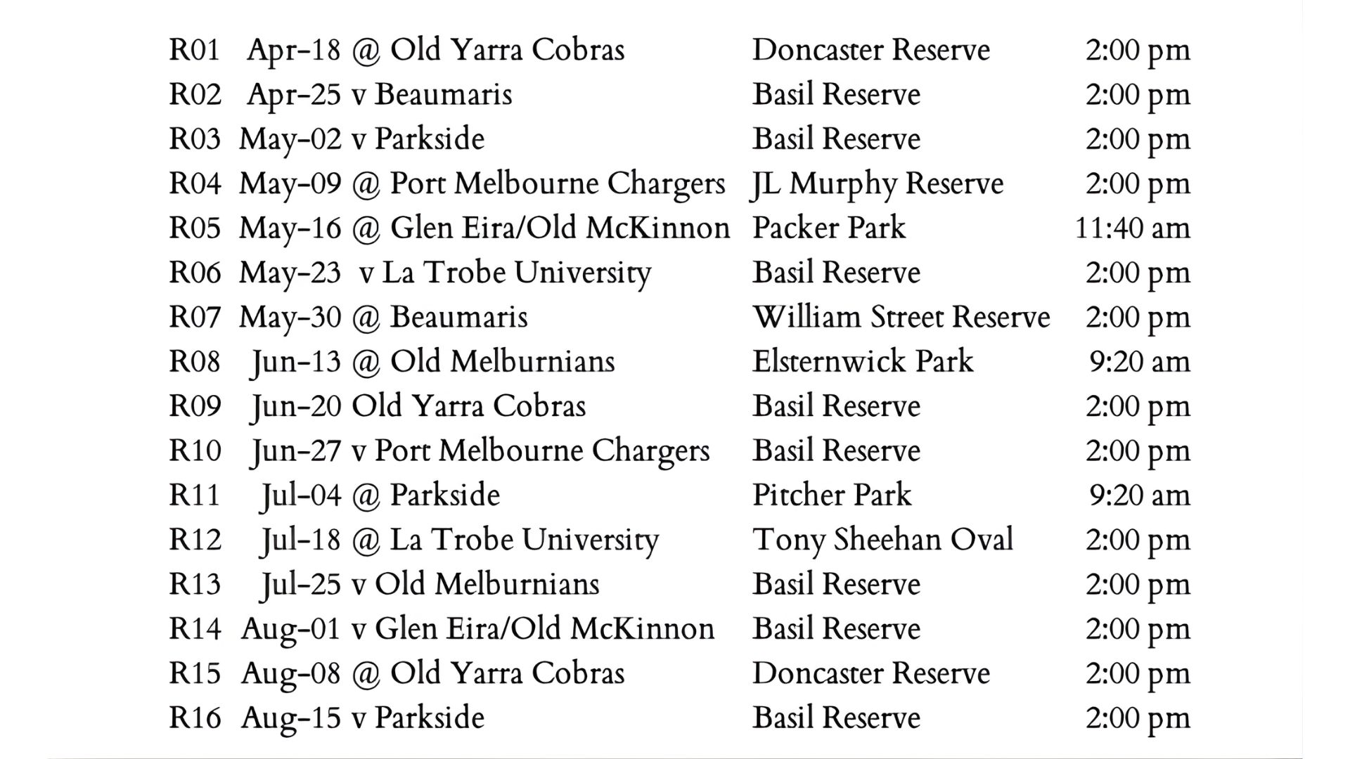 (Note: Venues and times are subject to change. The times quoted here are the proposed start time for the Seniors, who will in most cases follow the Reserves)
